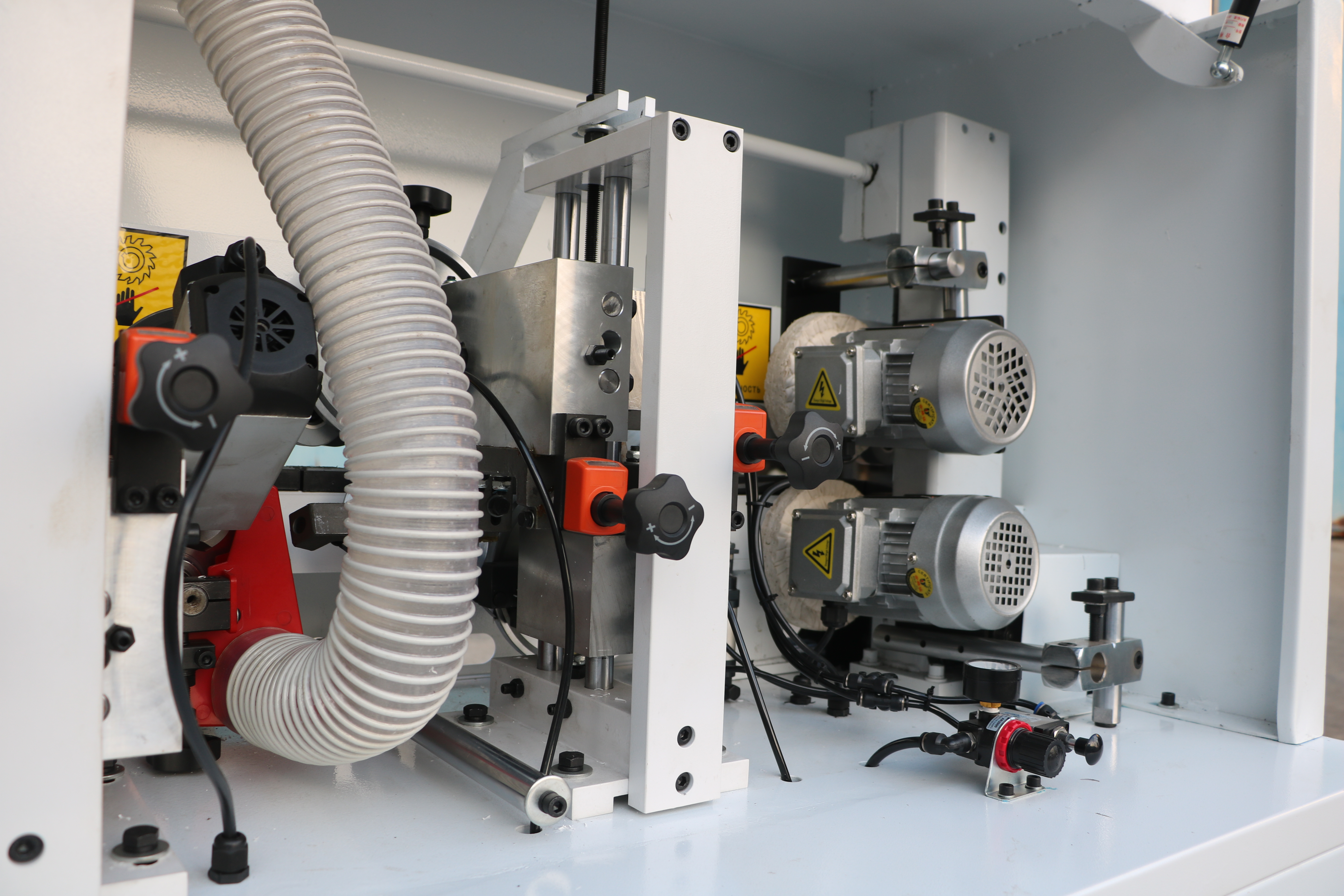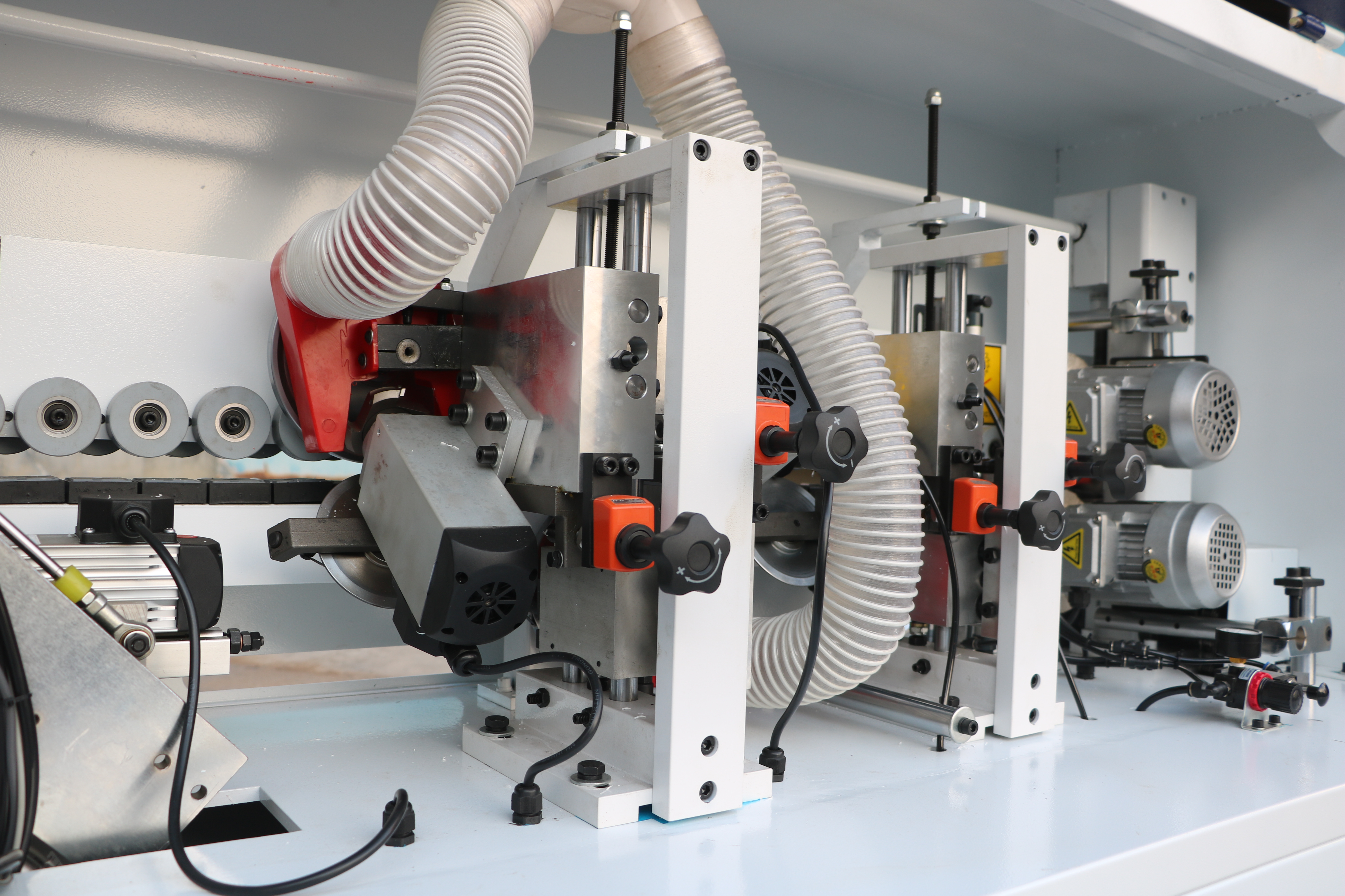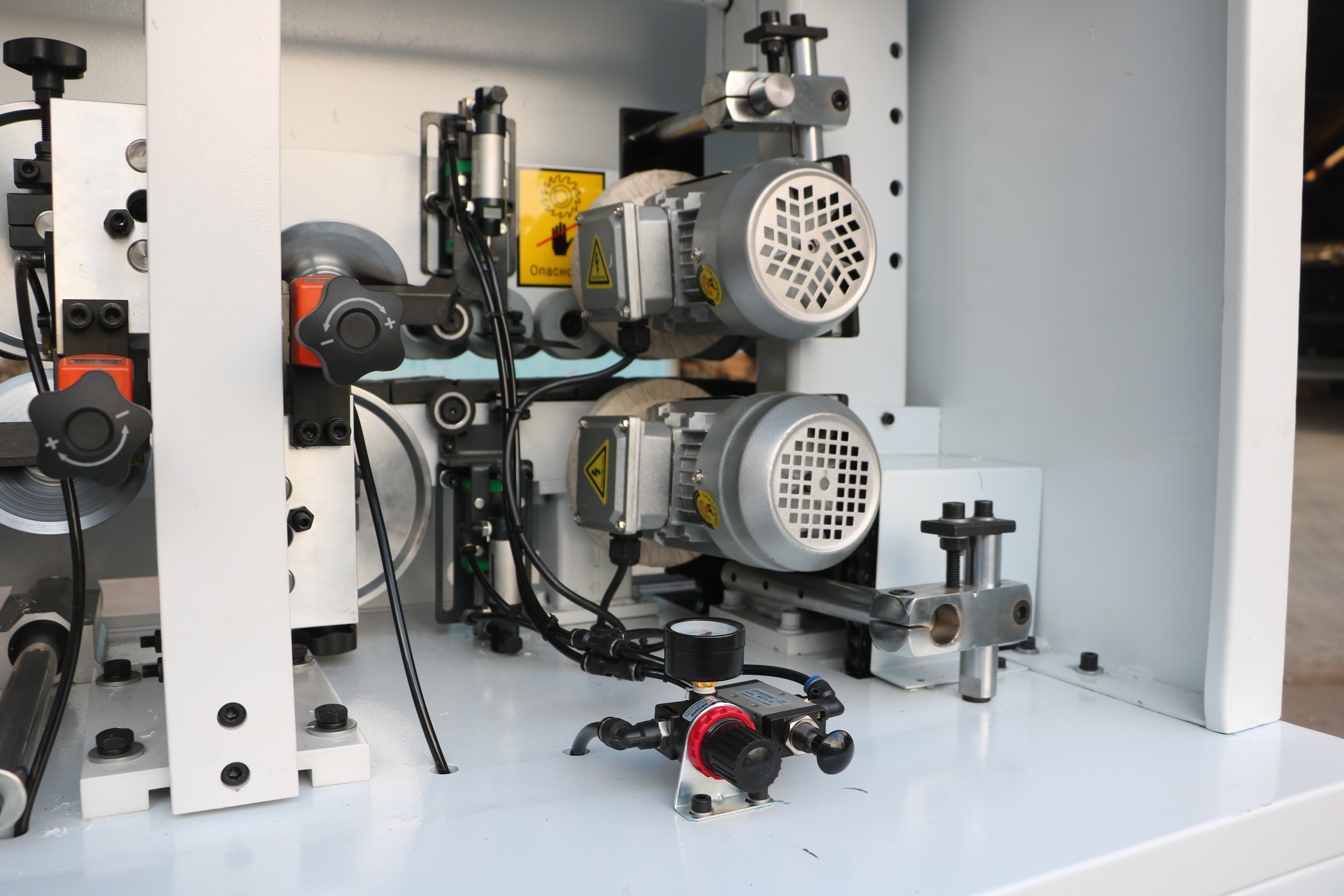 Прижимной блок с пневматическим управлением оснащен одним основным и двумя допрессовочными роликами со скребками, давление на ролики может регулироваться в зависимости от типа используемой кромки и деталей. Каждый ролик оснащен индивидуальным пневмоцилиндром.