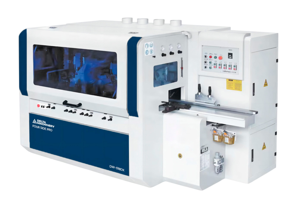 Четырёхсторонний 5-ти шпиндельный станок DELTAMACHINERY FOUR SIDE PRO DW-518DX предназначен для высокоточной четырехсторонней обработки деревянной заготовки с целью получения высококачественных изделий за один проход. После обработки на 4-х сторонних станках отпадает необходимость в последующем шлифовании профилированных и строганных поверхностей.