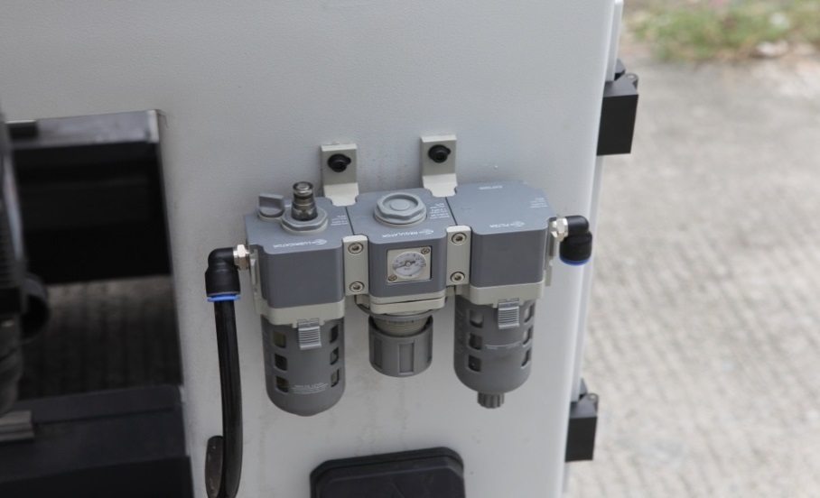 С помощью которого регулируется общее давление в пневмосистеме, а также первичная фильтрация подаваемого в станок воздуха.