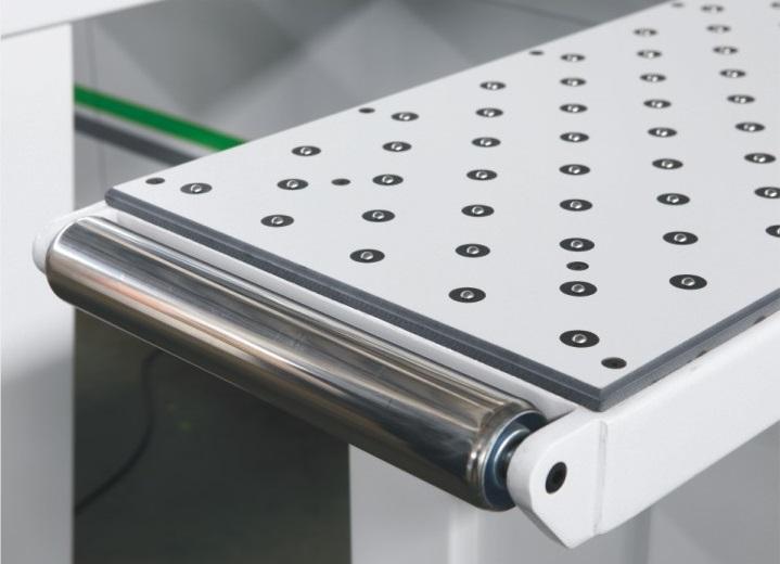 Передняя часть станка оснащена загрузочными столами. В комплектациях используются столы роликами для перемещения листов. Установлены столы с воздушным поддувом. Столы предназначены для загрузки плит ДСтП и выгрузки деталей и срезков, а так же для разворота пакета ДСП из продольного в поперечное положение по отношению к рабочей области станка.