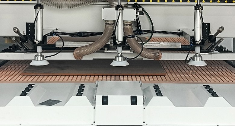 Для удобства загрузки обрабатываемых листов материала на стол предусмотрены специальные ролики. Кроме того, станок в базовом исполнении оснащен системой разгрузки, которая сталкивает обработанные детали и очищает стол от стружки. Всё это в целом ускоряет процесс производства.