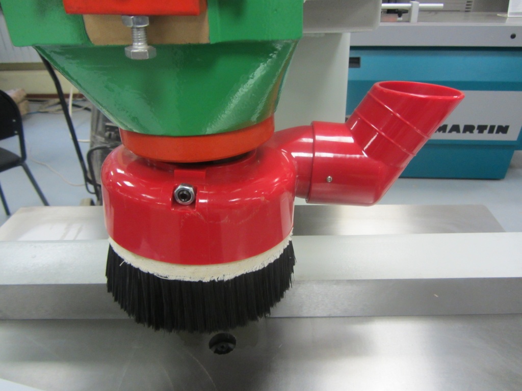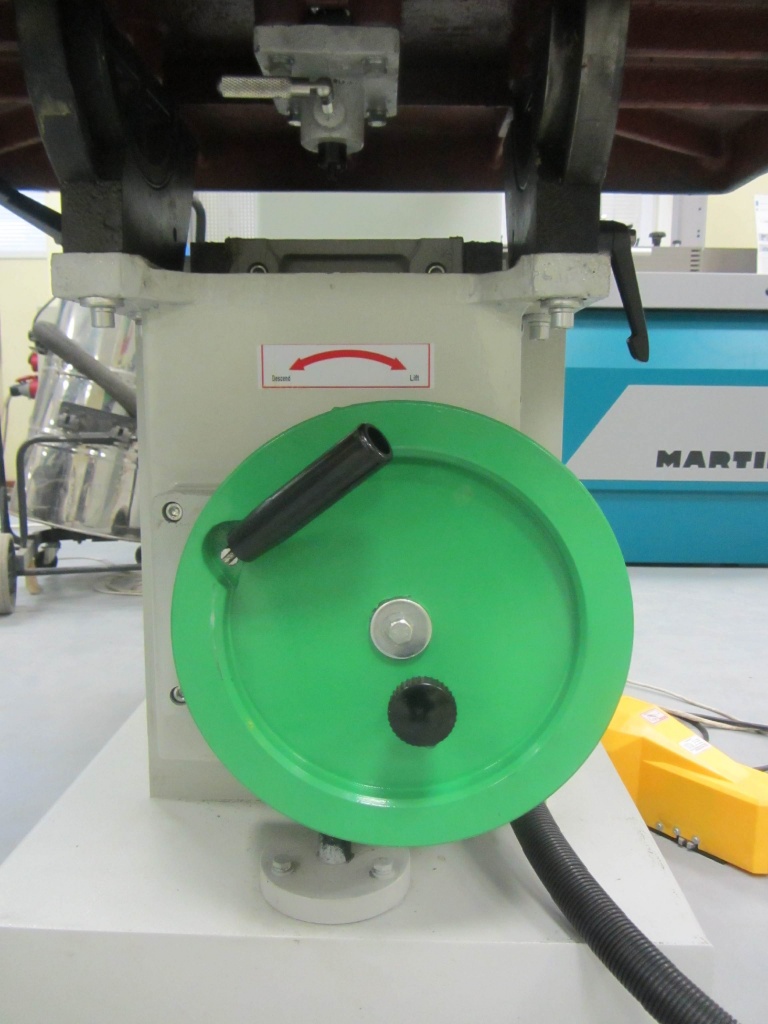 Регулировка высоты стола с помощью маховика. Механизм регулировки выполнен массивным, что снижает вибрационные нагрузки и гарантирует высокое качество обработки.