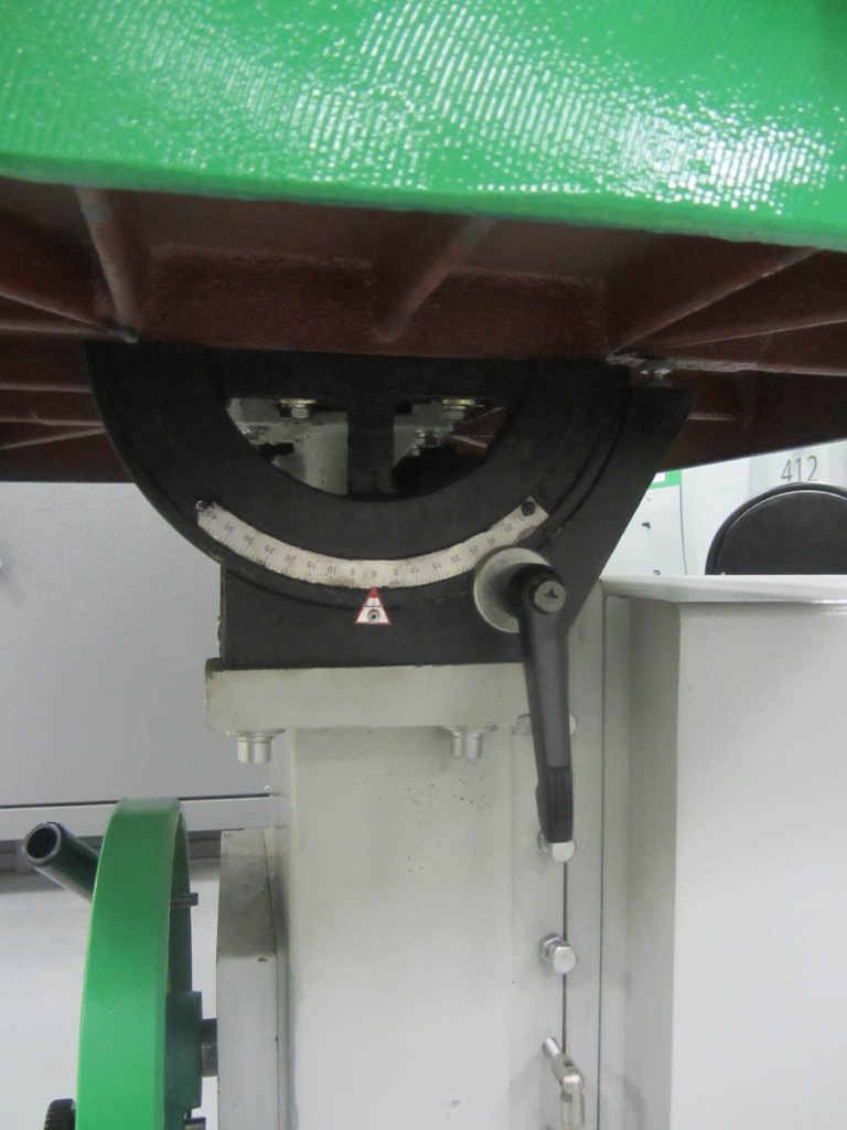 Угол наклона стола определяется по угловой шкале. Жесткая фиксация стола с помощью винта, обеспечивает высокую точность размеров заготовки.