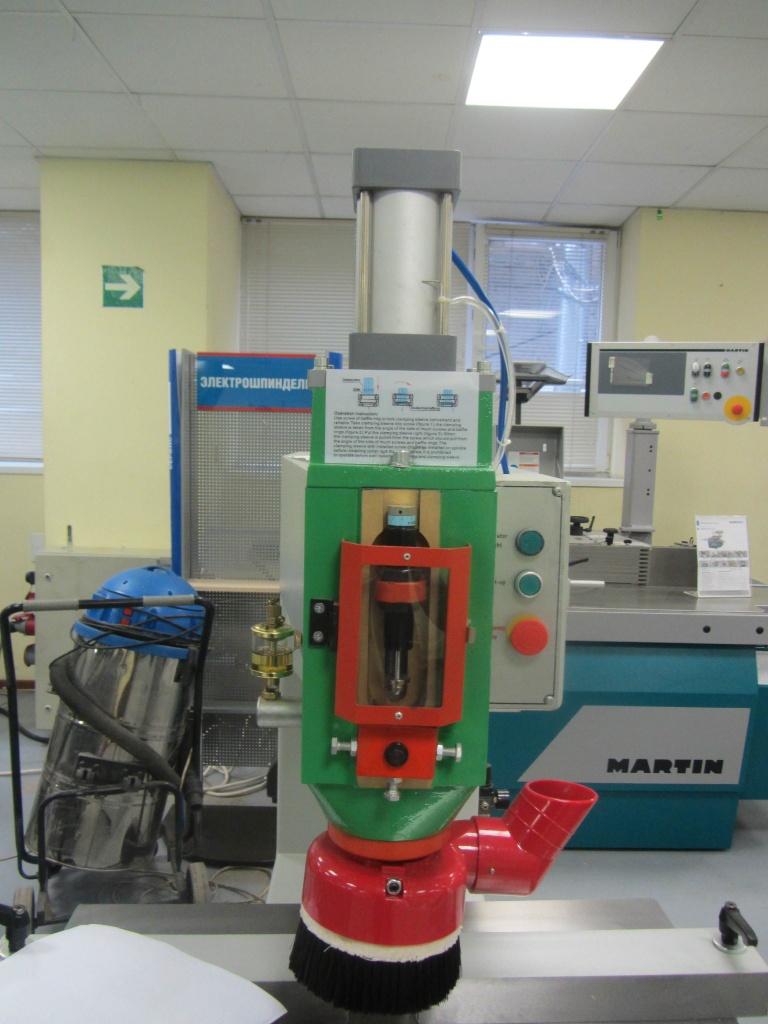 Вертикальный ход шпинделя от пневмоцилиндра. Осуществляется с помощью нажатия на педаль. Пневматика обеспечивает равномерность подачи шпинделя с инструментом и как следствие высокое качество обработки.