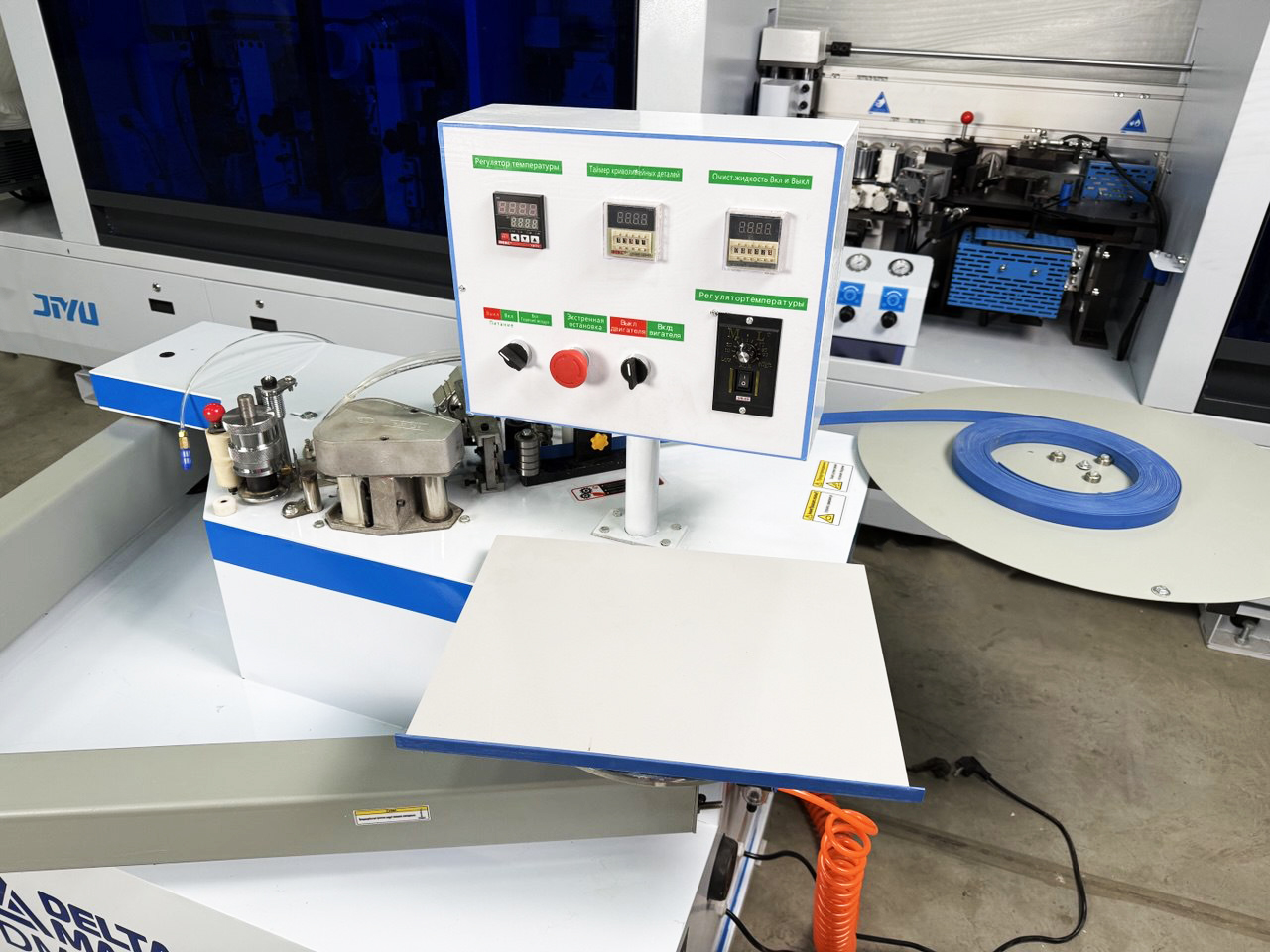 Надежная фиксация позволяет удобно работать как с малыми, так и с большими заготовками. Дает возможность в одиночку приклеивать кромочный материал на крупногабаритные криволинейные и прямолинейные детали