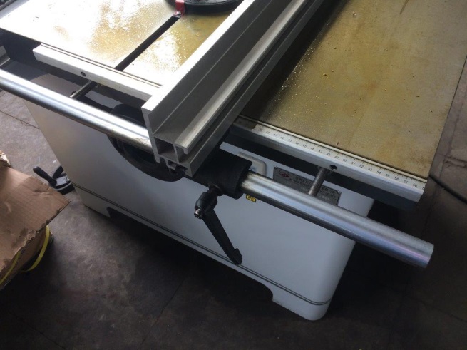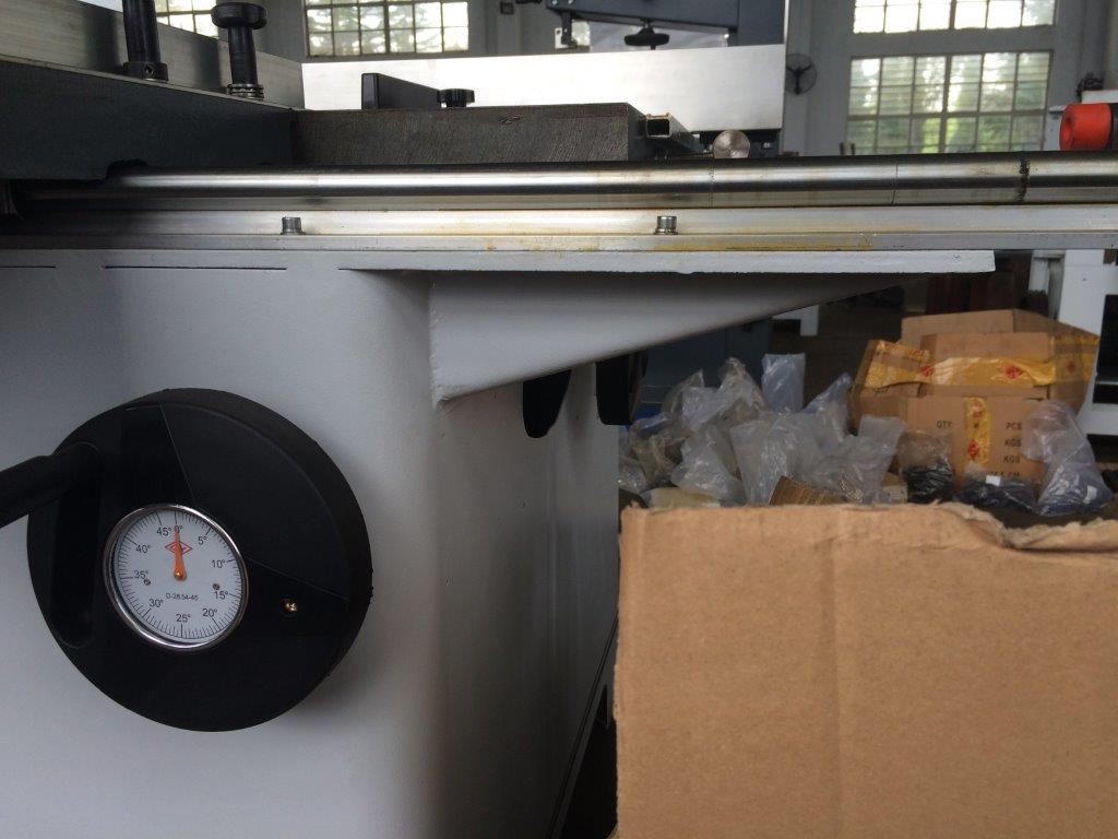 Для раскроя по ширине используется параллельный упор с миллиметровой шкалой, перемещение упора по массивной цилиндрической направляющей, для стабильности выставленного размера снабжен фиксирующим винтом.
