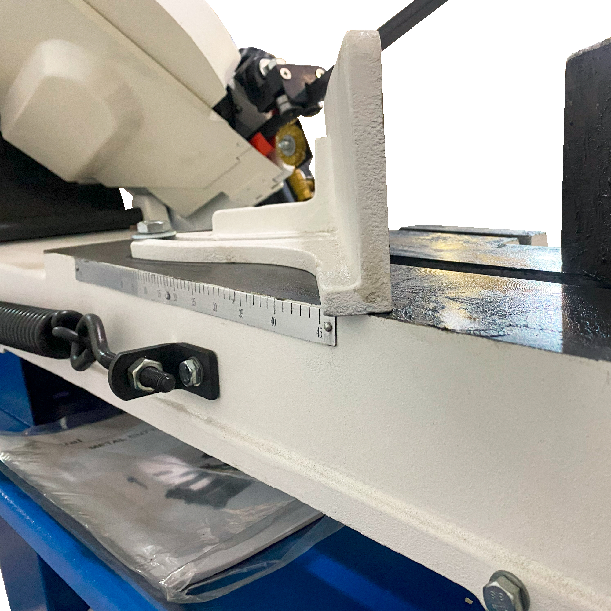 Позиционирование полотна под 90° относительно тисков обеспечивают подшипники, установленные на креплении режущего инструмента. Вылет крепления можно изменять в зависимости от размера обрабатываемой заготовки.