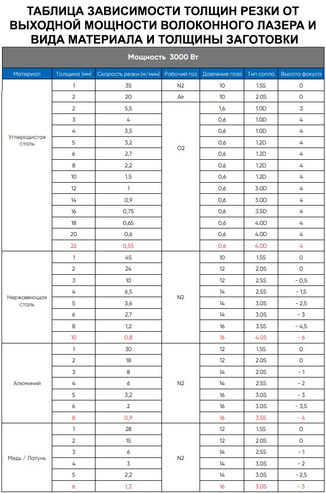 ВОЛОКОННОГО ЛАЗЕРА И ВИДА МАТЕРИАЛА И ТОЛЩИНЫ ЗАГОТОВКИ
