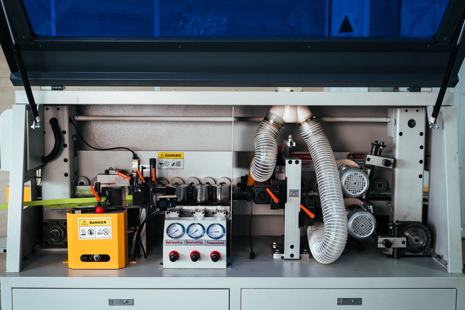 Два двигателя с полировальными кругами имеют регулировку по вертикали и горизонтали для точного позиционирования фетра в зону обработки кромочного материала.