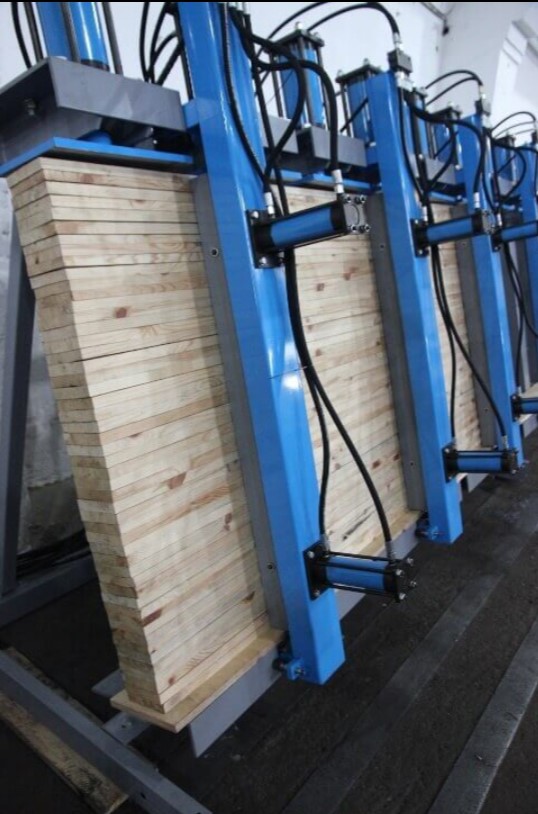 Давление в гидросистеме, в зависимости от ширины ламелей и породы дерева, предварительно устанавливают в соответствии с диаграммой. Рекомендуемые значения давления при прессовании ели и сосны — 3–5 кгс/см2, березы и лиственницы — 5–7 кгс/см2, дуба и бука — 7–9 кгс/см2. Давление регулируется на гидростанции. Настройка рабочего давления гидростанции осуществляется шестигранным ключом. Время выдержки под давлением (склеивания) определяют в зависимости от характеристик применяемого клея.