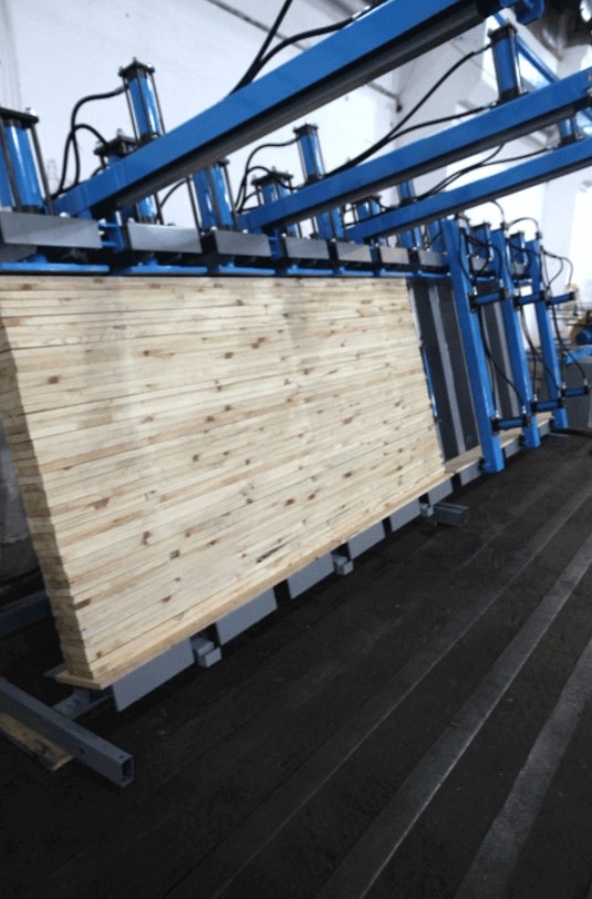 Оператор набирает пакет из заготовок с предварительно нанесенным клеем, далее устанавливает фронтальные прижимы. Процесс прессования начинается после включения оператором вертикальных гидроцилиндров работающих от установленного на пресс гидронасоса, обеспечивая тем самым равномерное распределение нагрузки на заготовки |
