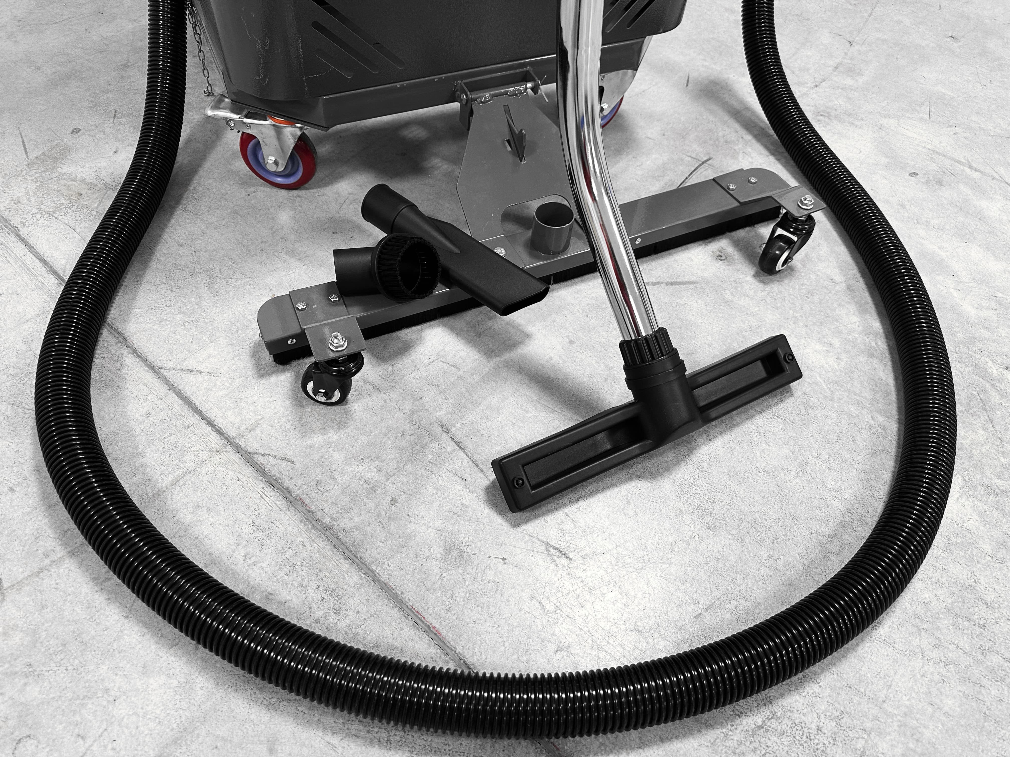 Пылесос имеет основную щетку шириной 70 см, для уборки больших площадей. Так же в комплектации шланг длиной 5 метров с насадкой от классического бытового пылесоса и дополнительными насадками для уборки в труднодоступных местах.