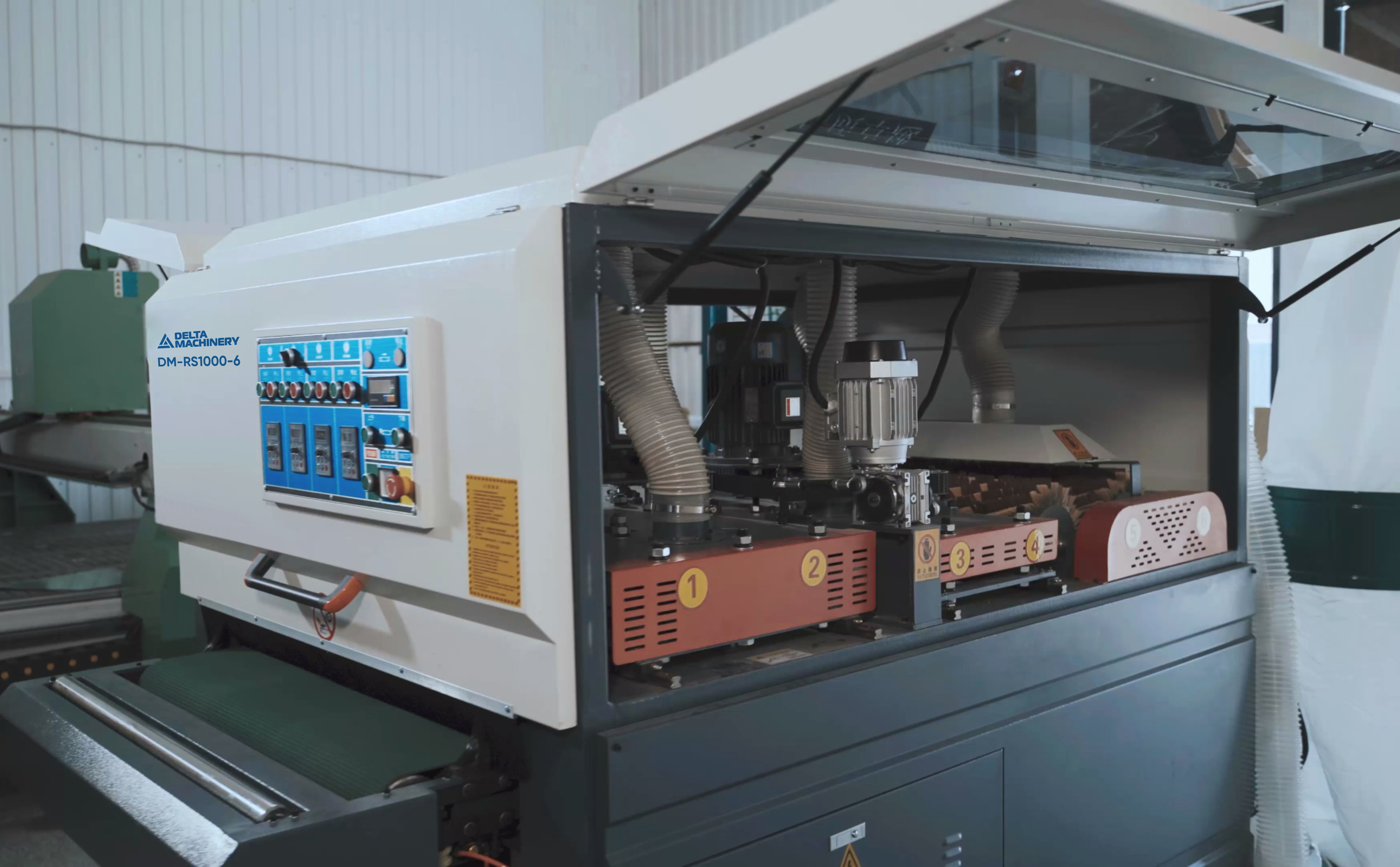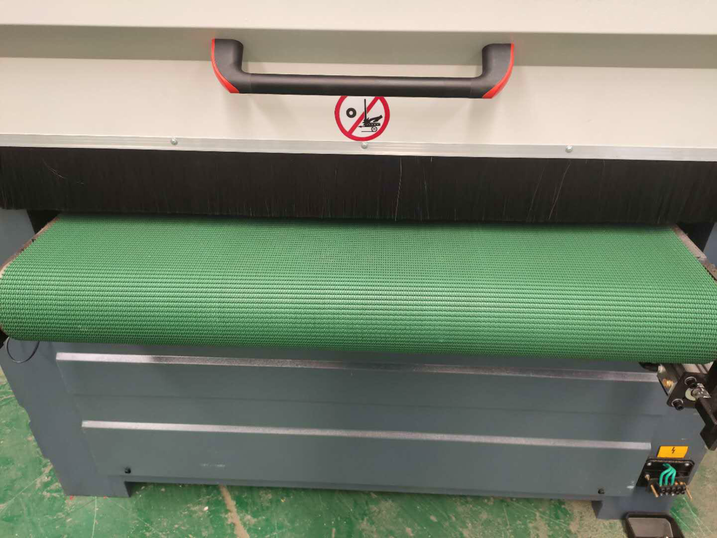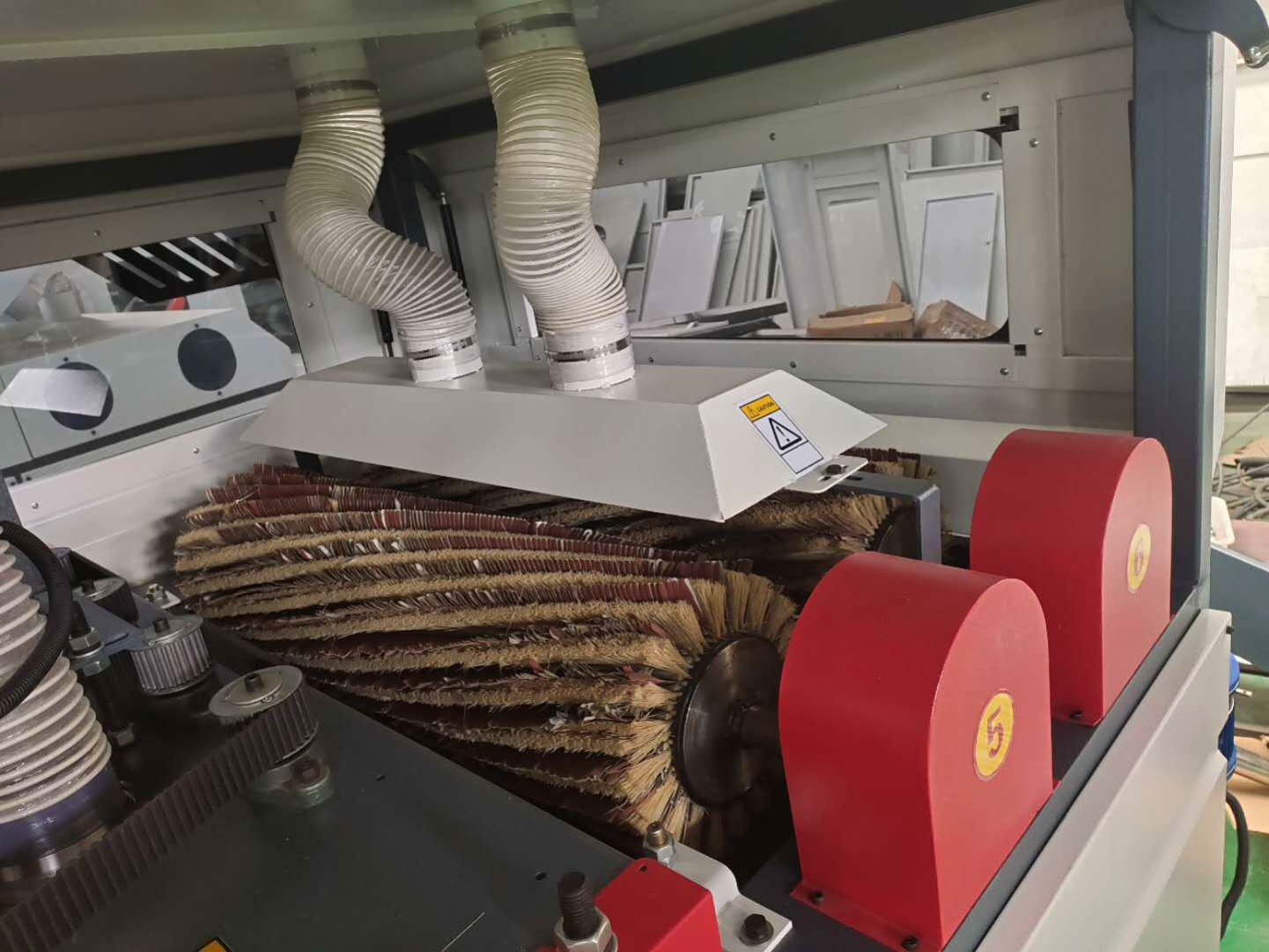 Финишным этапом обработки является продольный шлифовальный блок (два барабана во всю ширину рабочего стола, с щетками расположенными по спирали)