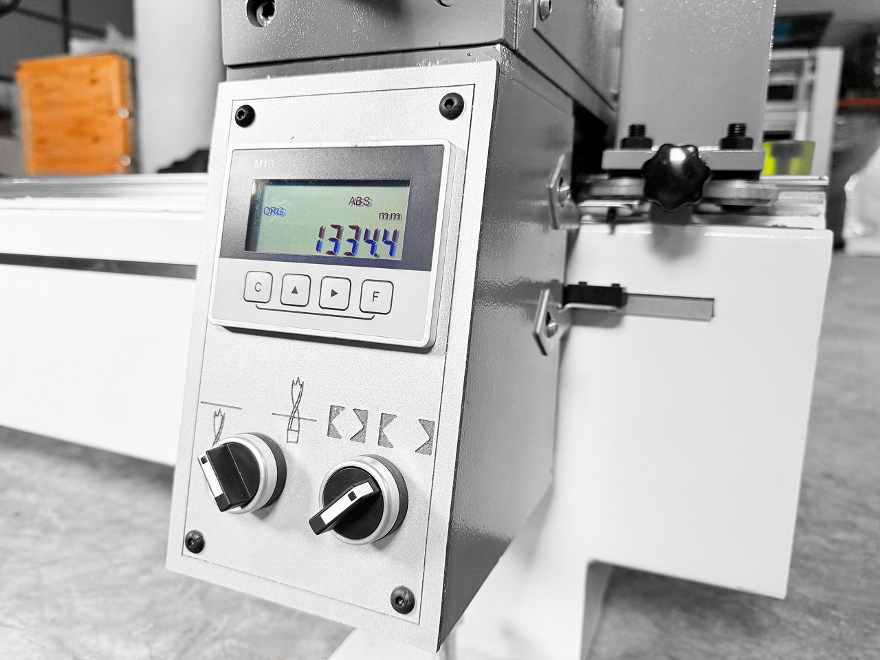 Фиксация траверсы на заданном размере производится с помощью механического тормоза, активируемого переключателем, расположенным рядом с электронным табло.