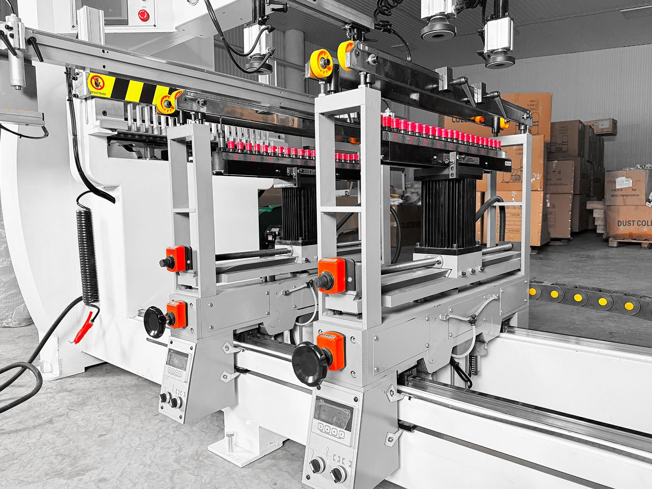 Все силовые и управляющие кабели и шланги скоммутированы в специальной трек-шине, это обеспечивает надежную и безопасную работу сверлильных групп при постоянном пере-мещении на разные размеры.