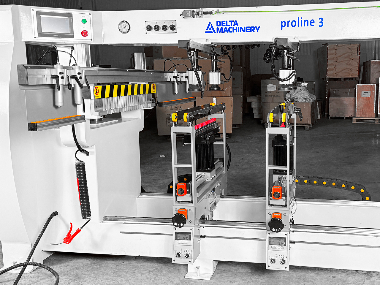 За позиционирование детали по глубине отвечают 4 пневматических упора, выбор необходимых упоров производится с помощью переключателей на центральной панели, что значительно сокращает время позиционирования детали и сокращает время присадки.