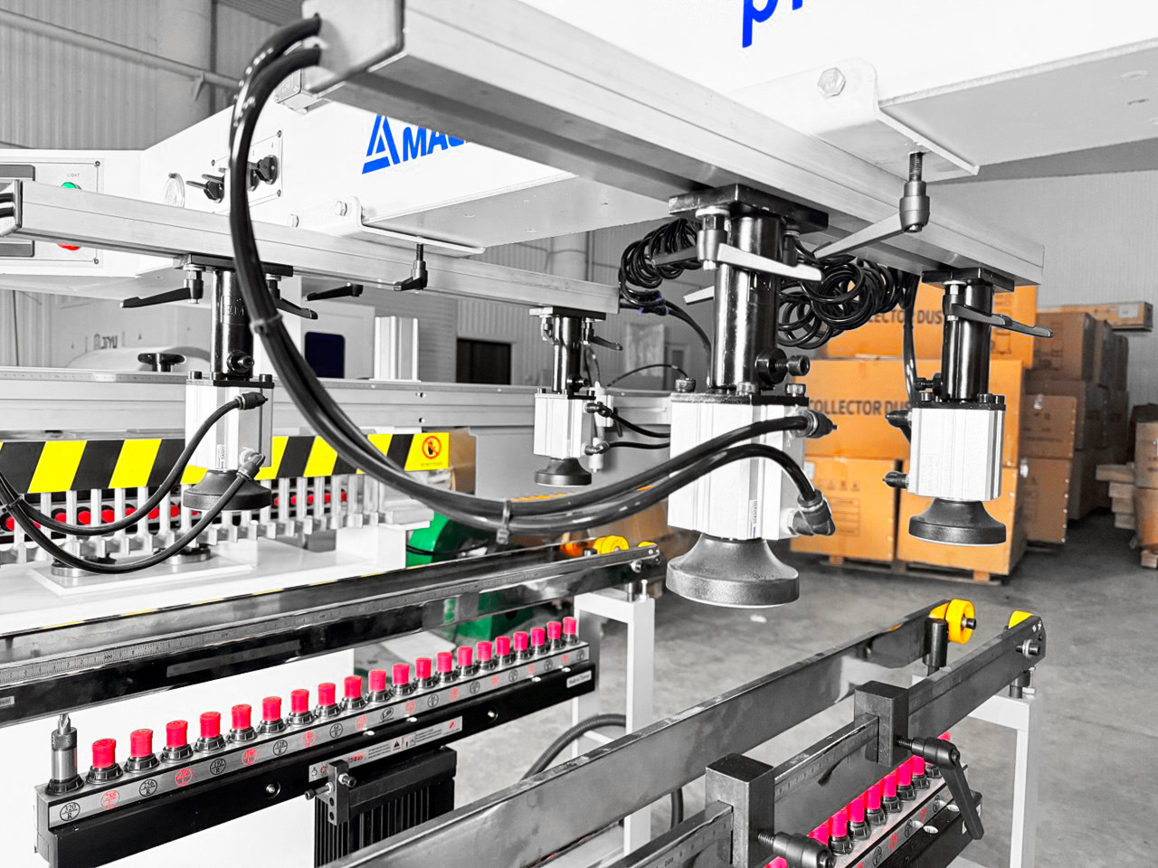 За фиксацию деталей в процессе цикля сверления отвечают 4 регулируемых пневматических прижима.