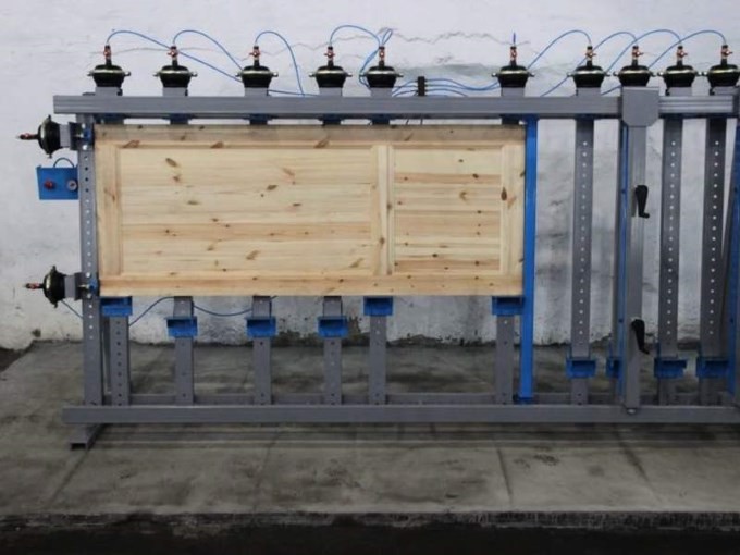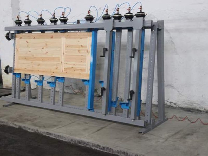 10 пневматических вертикальных струбцин, для удерживания заготовок в сжатом состоянии во время склеивания;