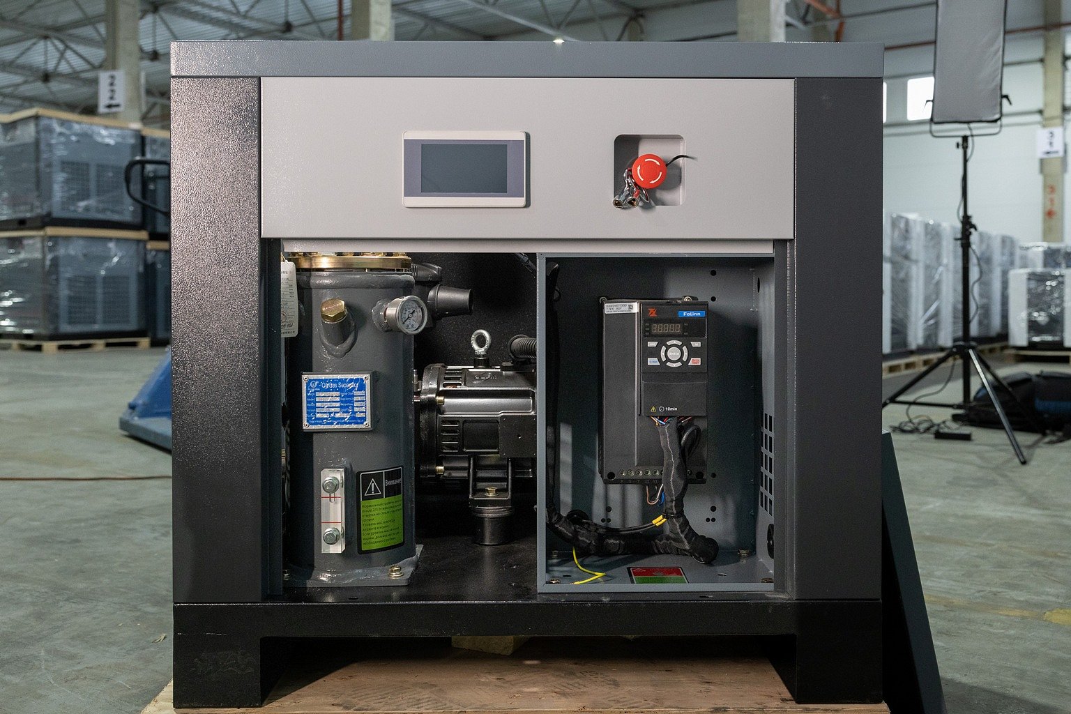 Обеспечивает плавный пуск и остановку компрессора. Так же плавный пуск позволяет снизить пусковые токи двигателя, что помогает не перегружать линию электроснабжения. Так же преобразователь частоты обеспечивают защита компрессора от различных аварийных ситуаций, таких как перегрузка, короткое замыкание, потеря фазы и другие.