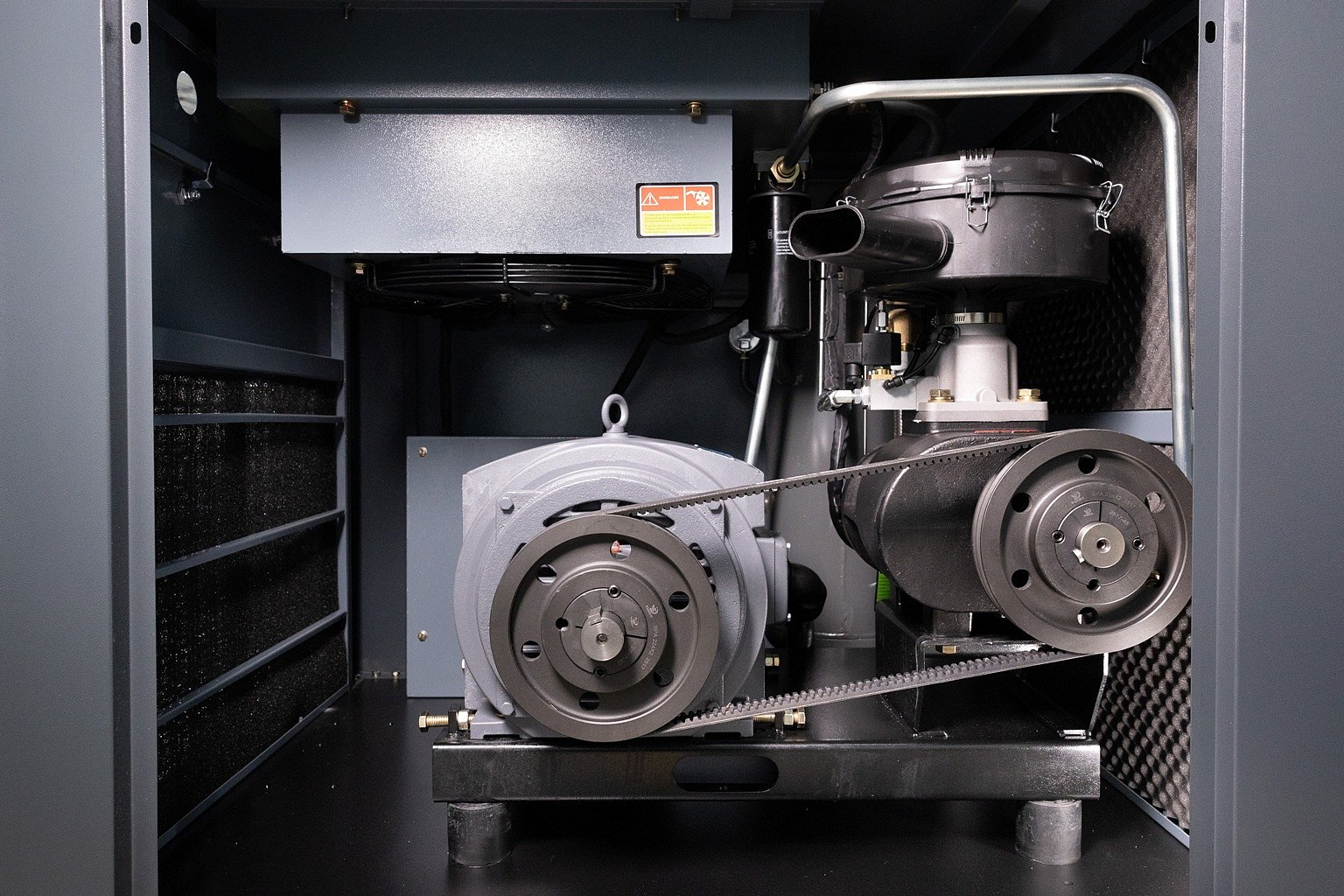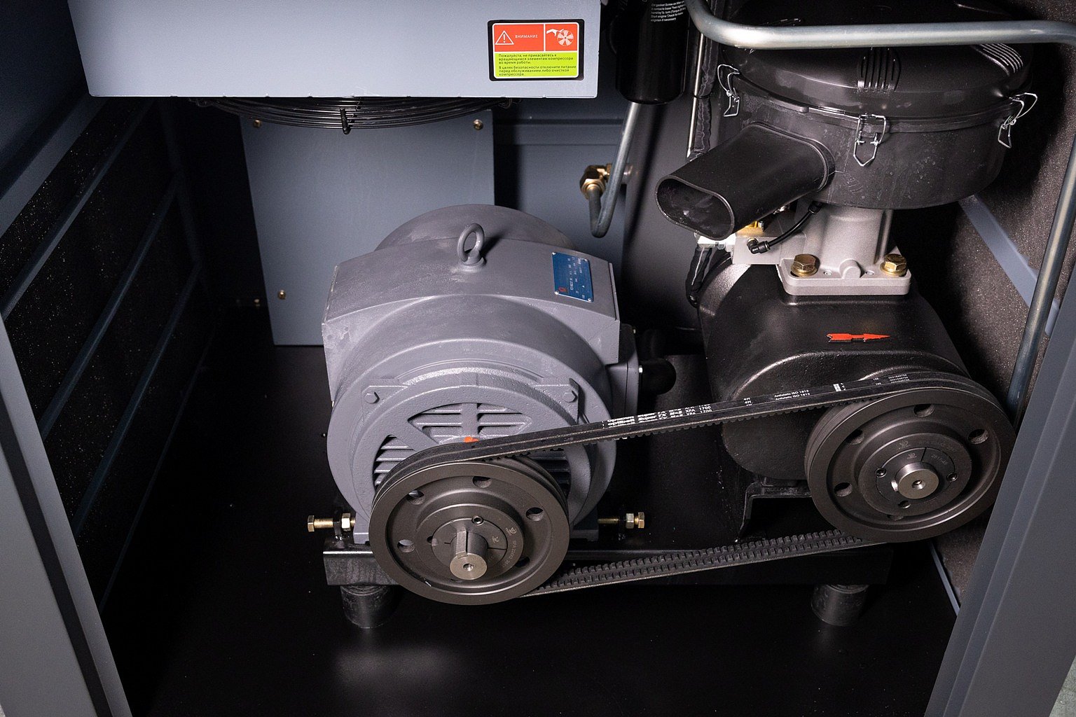 Клиновые ремни передают до 97% КПД с электродвигателя на винтовой блок, а также способствуют исключению вибрационных нагрузок во время пуска компрессора. Конструкция максимально проста, у неё самый высокий показатель удобства обслуживания приводных механизмов. Общая масса компрессора будет выше, чем на прямом приводе, что способствует устойчивости конструкции к вибрации и раскачиванию.